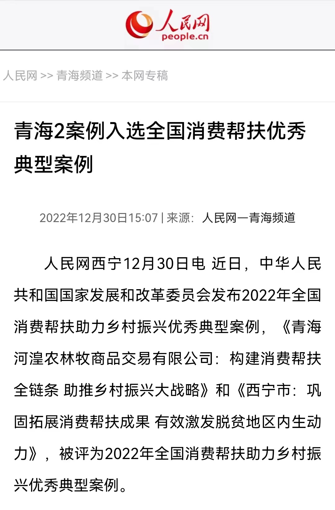 喜報 | 青海農林牧商品交易中心入選國家發改委 2022年全國消費幫扶助力鄉村振興優秀典型案例